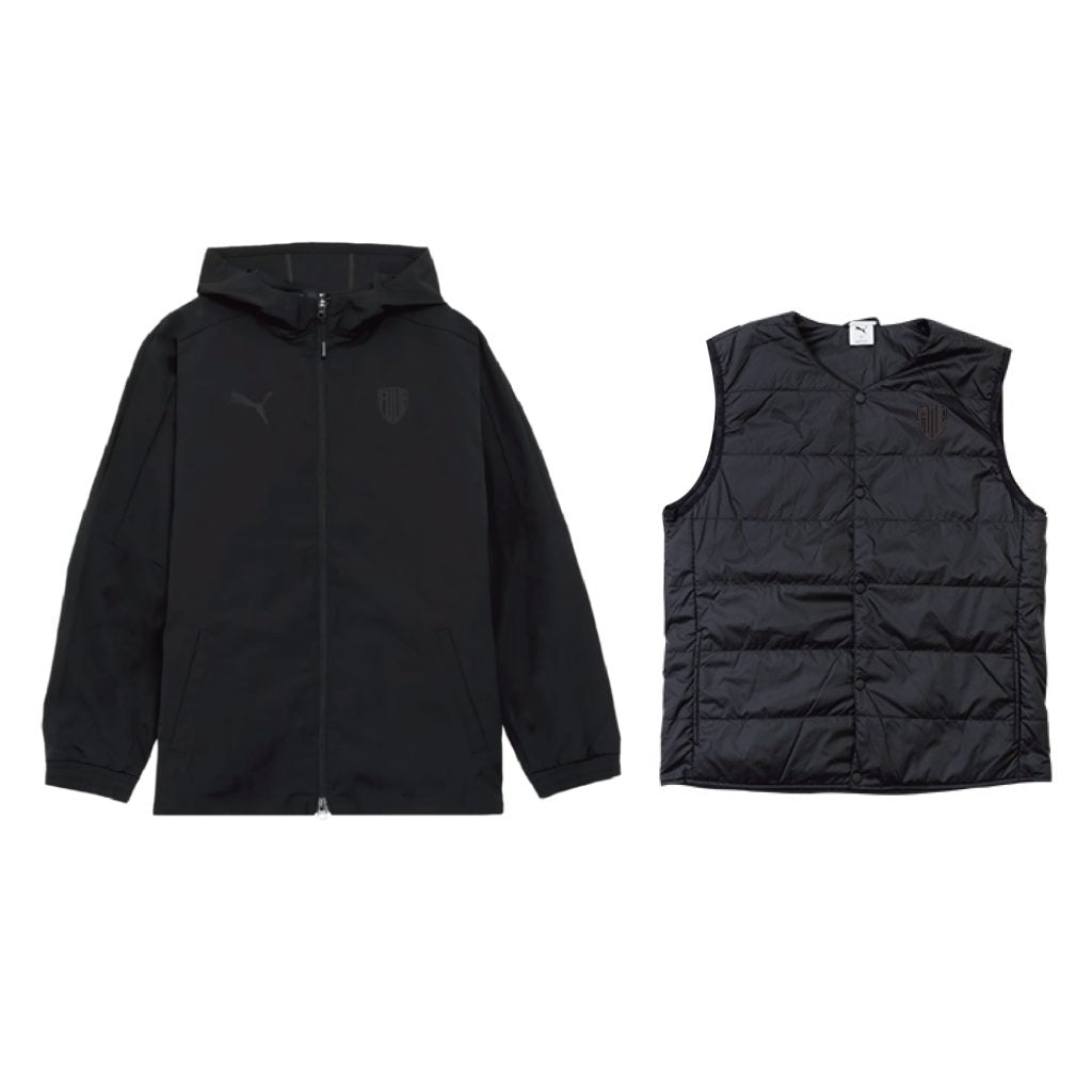 取り外し可能な中綿入りベストを内蔵しており、ボタンで簡単に脱着できる設計です。プーマロゴとFULIEロゴがアクセントになっています。天候やシーンに応じて、ジャケット単体、ベスト単体、中綿ベスト+ジャケットの3通りのスタイルを楽しむことができます。快適さと機能性を高い次元で両立し、あらゆる場面で活躍する一着です。
